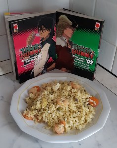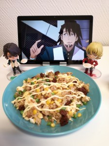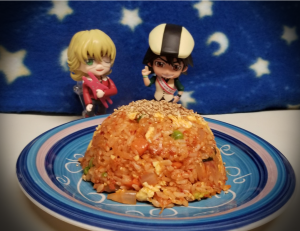 From AKI. “Tiger and Bunny holds a special place in my heart and is just such a wonderful series. Back when the show was airing 10 years ago, I was only a young teen and didn’t really know about the fanbase or had even known about the fried rice event! So, 10 years after the fact, I’m glad I could at least participate this time around to show my love! (I hope Kotetsu and Barnaby likes my island fried rice!) I can’t wait to see everyone else’s friend rice pictures!! ∠( ᐛ 」∠)_”