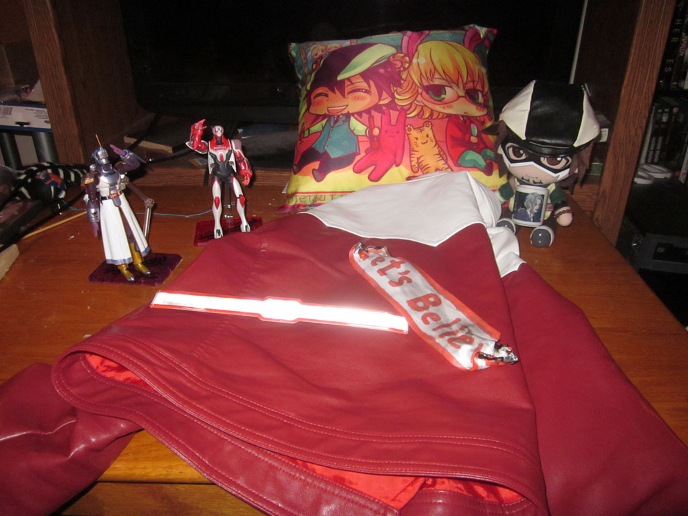 From MeisterGao. “Would had attached my home-made bunny plush but the cats were sleeping on it! The burnt banner was made by a friend of mine and I keep it safe! My favorite item has yet to be finished, but my Kurayami who is visiting said they will bring it with them when they visit! (It’s the Lunatic tie ❤ )"