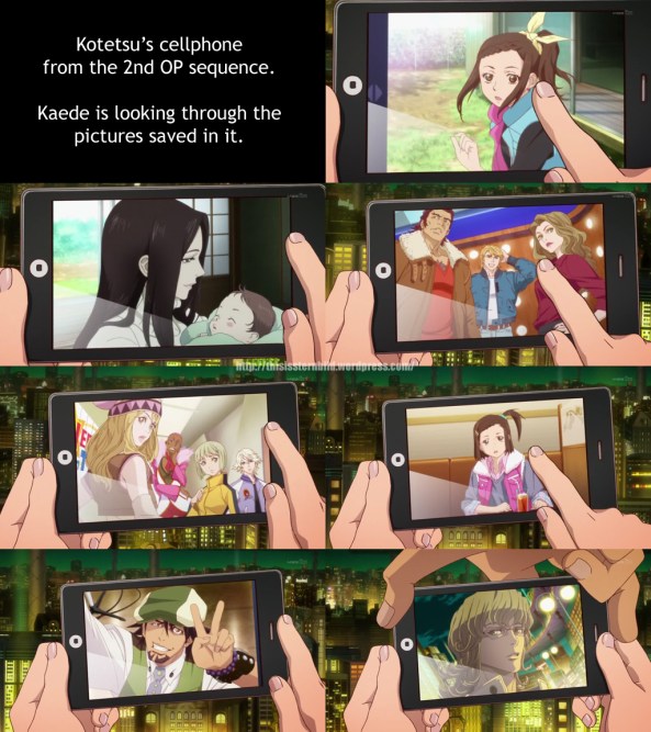After Antonio, the camera switches for a while to Kotetsu’s cellphone. It’s held in small hands so the only one who could be holding it is Kaede (confirmed by the director on Twitter). She’s looking through the pictures saved there.