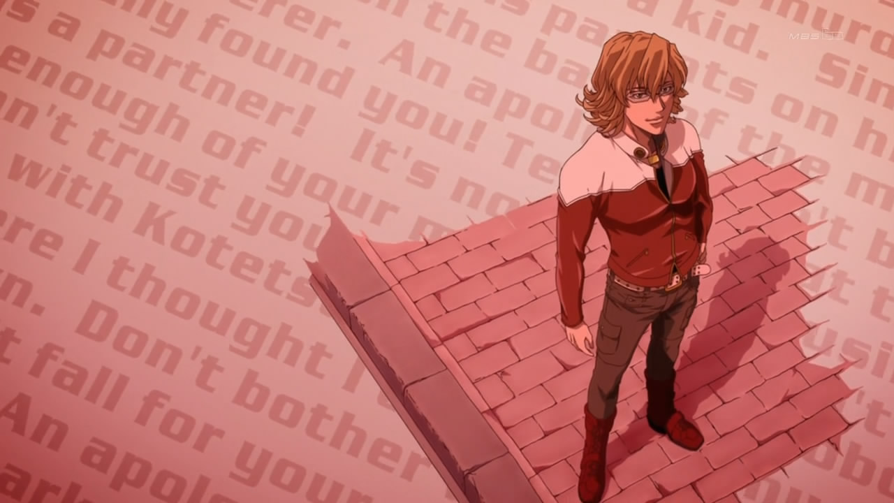 I’m all a week late, trollin’ around as I wait for episode 15 to come on, but… isn’t this new ending theme so…. 1990’s anime? Like, Cowboy Bebop, Weiss Kreutz… it just transported me to an era of ending themes that were… a lot like this. Maybe it’s the monochrome, or the cheesy Gundam-Wing-esque “everyone in front of a wall of graffitti” pose, or the voice of the singer, or all. But it was a good feeling. ^_^