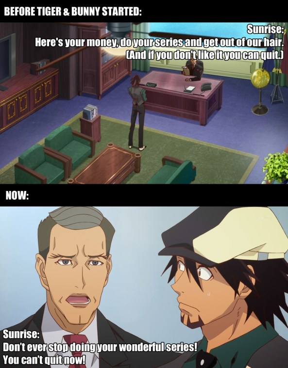 “Spoiler”: Nobody expected Tiger & Bunny to be a big hit. Currently we’re placing bets on whether they’ll announce S2 or a movie by the end of the season. (I want a movie, I think Aki’s more for a second season.)