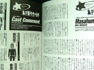 Hero TV Fan vol. 1 focuses on the voice actors. There’s three interviews with them and an interview with director Keiichi Satou. Satou’s interview is not the same that’s in Official Hero Book. As a con only one of the voice actor interviews is new; the interview with Masakazu Morita (Barnaby) and Koji Yusa (Yuri/Lunatic). The other two interviews are reprints. Hiroaki Hirata (Kotetsu) and Masakazu Morita’s (Barnaby) interview in Cool Voice and Go Inoue (Keith), Kenjiro Tsuda (Nathan) and Taiten Kusunoki’s (Antonio) interview in Pash! Deeep. If you don’t have these magazines already and like the voice actors, you might want this book for the pictures.