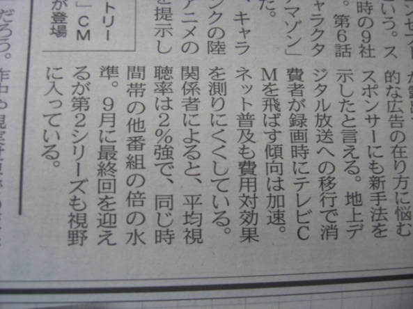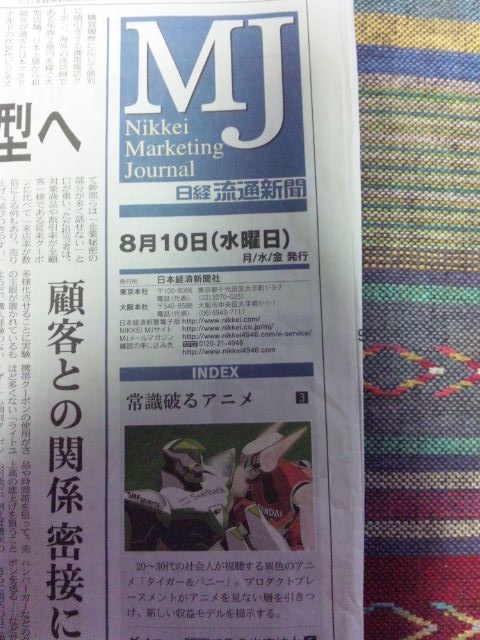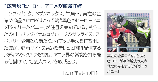 I was tracking down the article and found that Tiger & Bunny is actually one of today’s Nikkei Marketing Journal’s main news. In short, the headline on the site reads “Bill-board Heroes Break Down the Common Rules of Anime” and the blurb text seems very excited about the new business model Tiger & Bunny has presented.