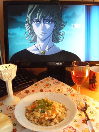 So, Aki and I were talking about making fried rice next week (I think she’s never eaten fried rice before, the horror!) and I said I would put pictures of Kotetsu and Barnaby on my screens and set the table and offer them my fried rice. And I’d take a picture of it and post it because I’m a derp like that.