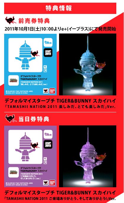 Tamashii Nation 2011 site has some Tiger & Bunny items as exlusives only available at the event. The blue and purple see-through Sky High superdeformed figures are items given away with the tickets; blue ones when you buy your ticket in advance through e+ and purple ones with tickets bought at the event.