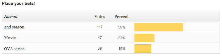 This one I ran in July, after 2nd cour had started. It seemed pretty obvious at the time that we’d get some continuation, but we still don’t know what. I’m kinda tempted to run it again and see if the result would be different. I think I voted for a movie myself, but now I’d vote for S2…