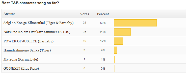 This was also in the main page sidebar for the past week, and the result pretty much reflects my own preference when it comes to the character songs. The Duet (yes I type it with caps, it deserves it) totally steamrolled all the other songs. It’s the one song that always makes me drop what I’m doing and just sing along like a dork when it comes up on shuffle. And hey, the soundtrack is coming out next week so we’ll get the full version of Natsu no Koi wa Otsukare Summer!