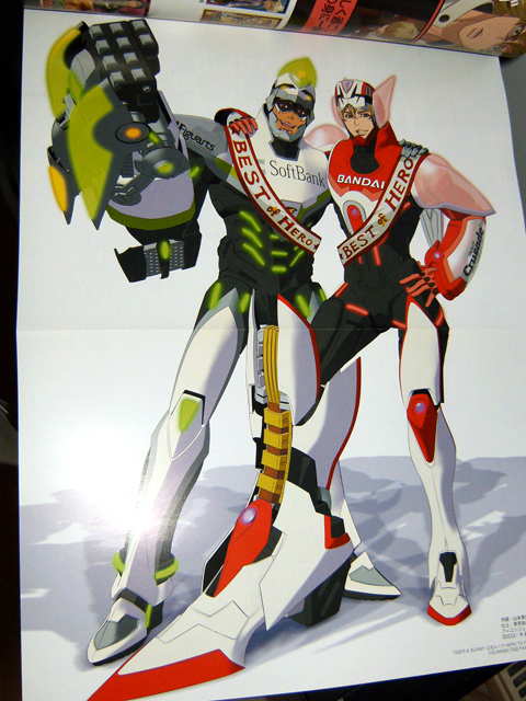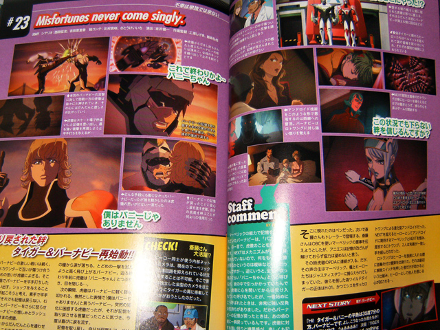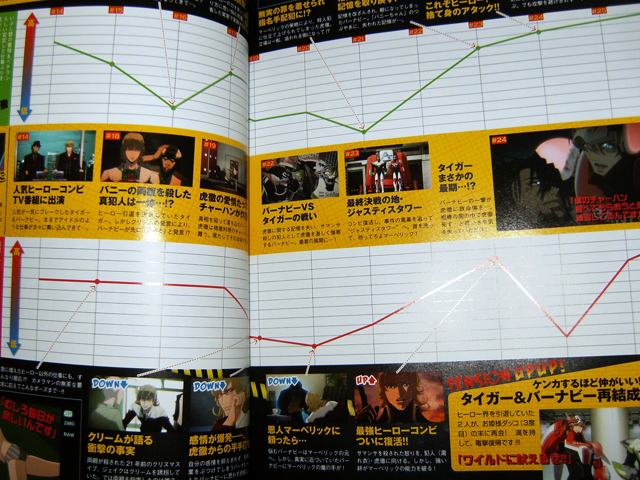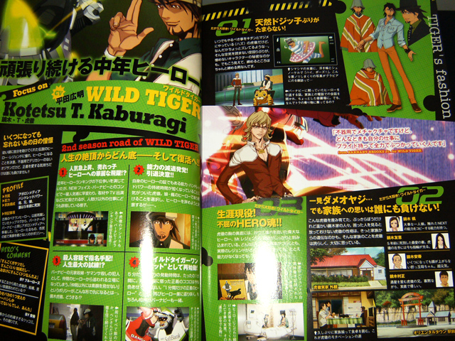 Hero TV Fan vol. 2 has a “mood graph” for Kotetsu and Barnaby, tracing their state through the 2nd cour. There’s a special illustration of Kotetsu and Barnaby by character designer Hayama Kenji, and a two page “creation archive” which is just a collection of character sketches. The Tiger & Bunny Mystery Files (one page) include even Scarf-tan.