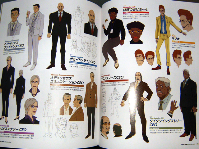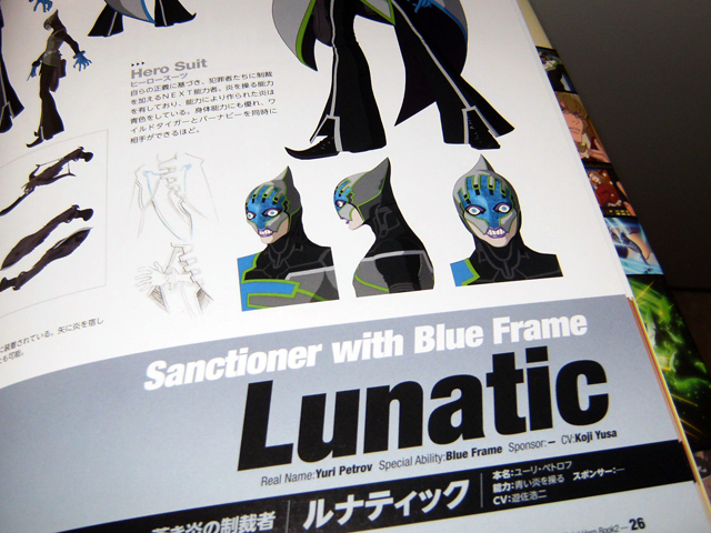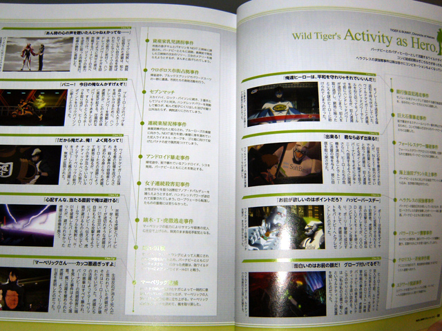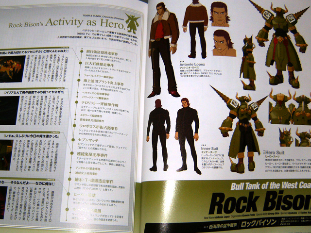 The character pages feel kind of supplemental to the ones in the first volumes of these books. There’s less art for each hero, but Official Hero Book 2 has a record of activity for them that spans both cours of the anime. Official Hero Book 2 spends four pages each for Kotetsu and Barnaby, two pages for the other heroes and Lunatic and his blue frames.The side characters get 12 pages with pretty good reference pictures.