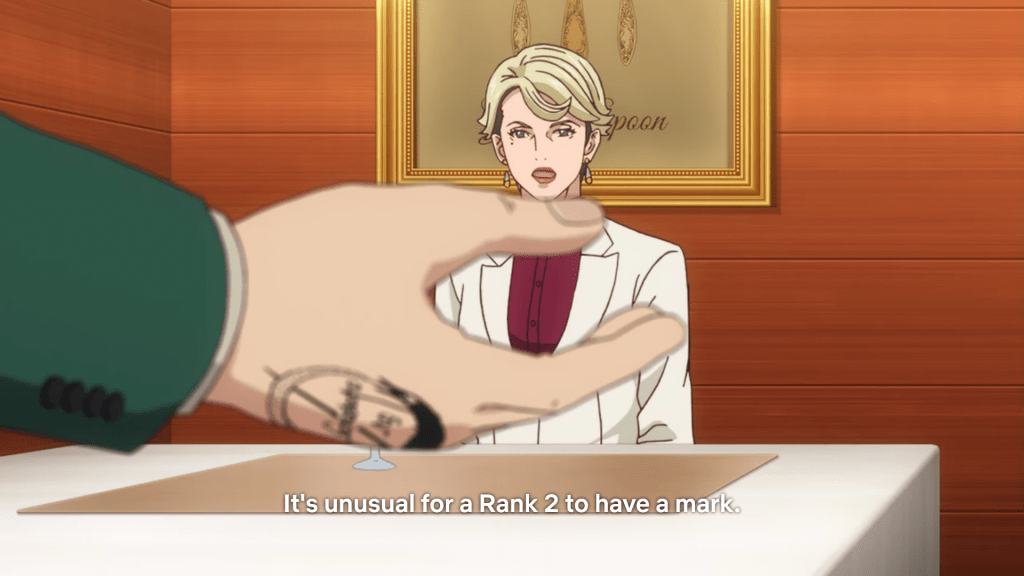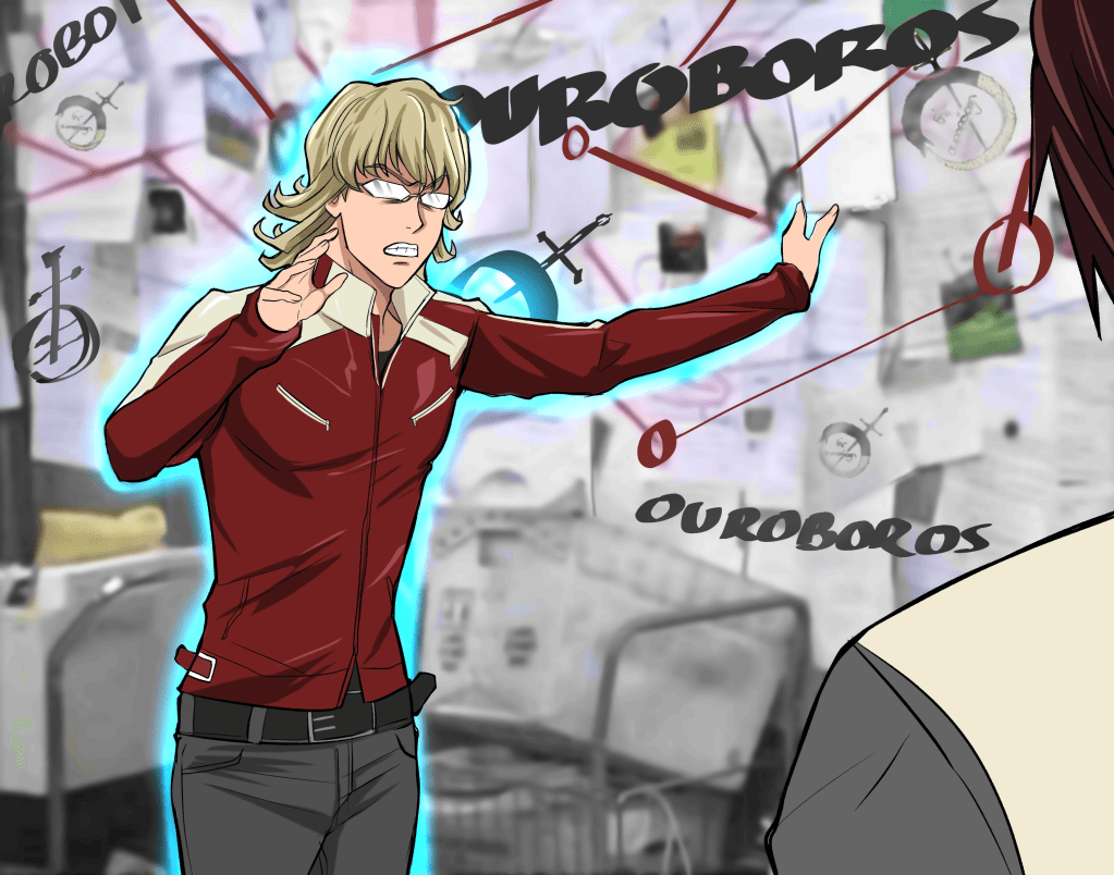 Before S2 the story took place in Stern Bild with a short detour to Oriental Town, so there were very few hints to the true size and scale of Ouroboros. They could just have been a mafia-like organization operating in a smaller area, but based on S2 they seem to operate worldwide. We see Nicolai Brahe with the twins Fugan and Mugan in what would be Switzerland in our world as they work their way through the heroes in other areas before coming to Stern Bild. There’s also a hierarchy with ranks, it seems that rank 2 and higher members don’t bear a tattoo to mark their affiliation. Brahe started lower and climbed the ranks so he has a tattoo, Jake Martinez had several tattoos as did Kriem, and the twins have tattoos as well.