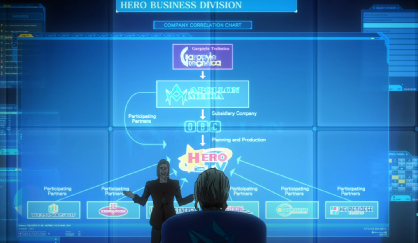 In The Rising, we see the business structure and company relations for Hero TV. Hero TV is broadcast on the in universe OBC network, which is a subsidiary of Apollon Media. At the same time Apollon Media is a participating partner on Hero TV.
