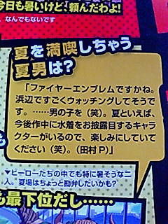 Tamura (producer): Fire Emblem, he’d do a lot of sight-seeing… of men. (laughs) And while we are talking about summer, there will be character(s) in swimsuit(s) in the show soon, so look forward to it!
