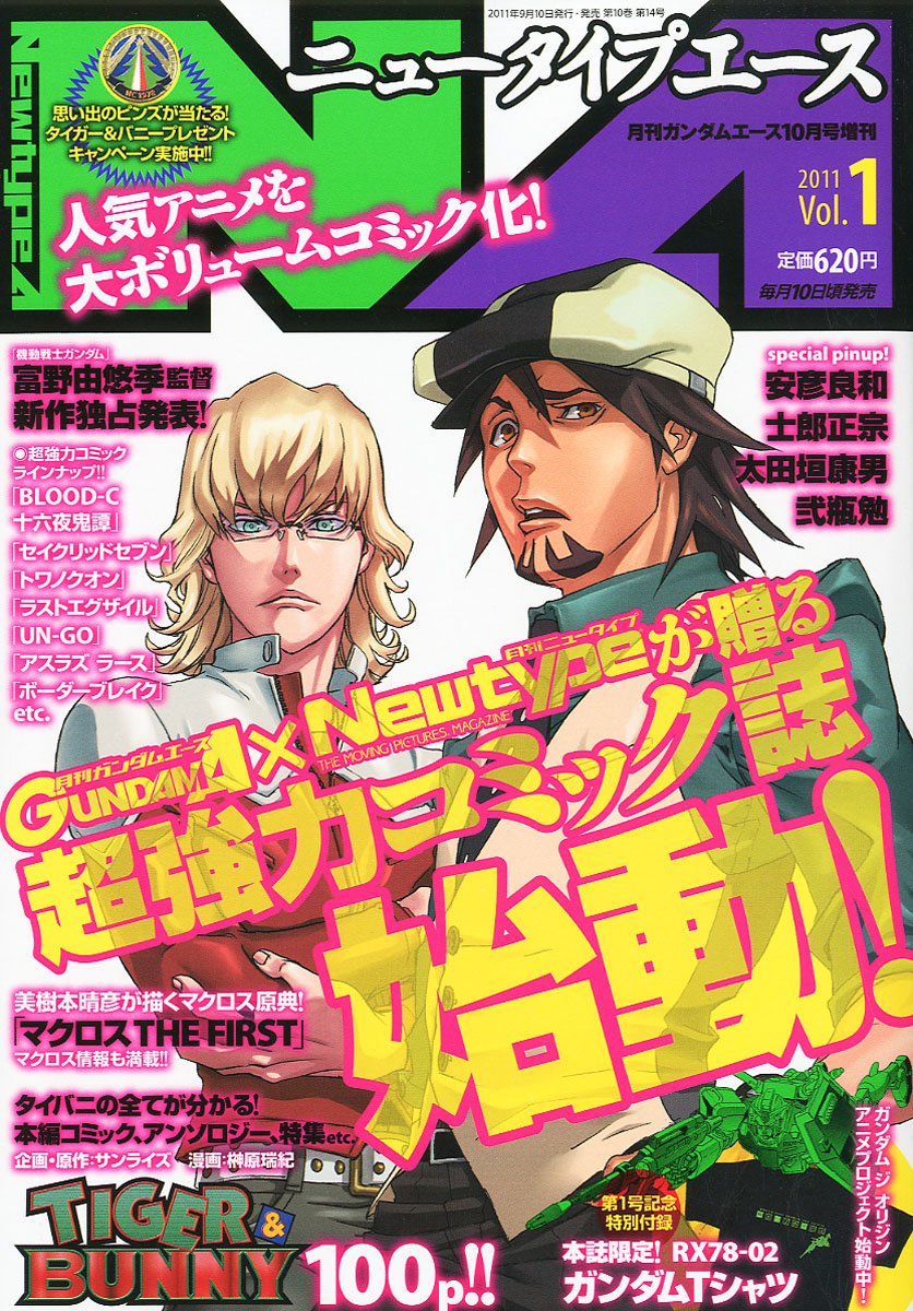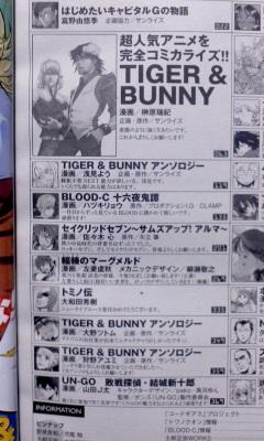 Update: I was wondering why the magazine cover says 100 pages of Tiger & Bunny yet I was told Sakakibara’s manga chapter is 54 pages. A photo of the list of contents shows three other Tiger & Bunny stories, all by the artists featured in the first anthology from Asuka Comics. I can’t make out the page numbers but the other three stories are definitely enough to bump the page count to 100.