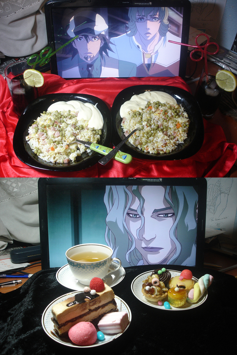 From Arima & Riza. “I cooked the rice today. I thought it would taste horrible, but it was edible, even good. In fact, it was amazing. Probably because of the mayonnaise xD Since Yuri is our favourite character, we made him some tea and bought him cake and sweets. Some cheating here, I can’t bake cakes. But he didn’t seem to mind.”