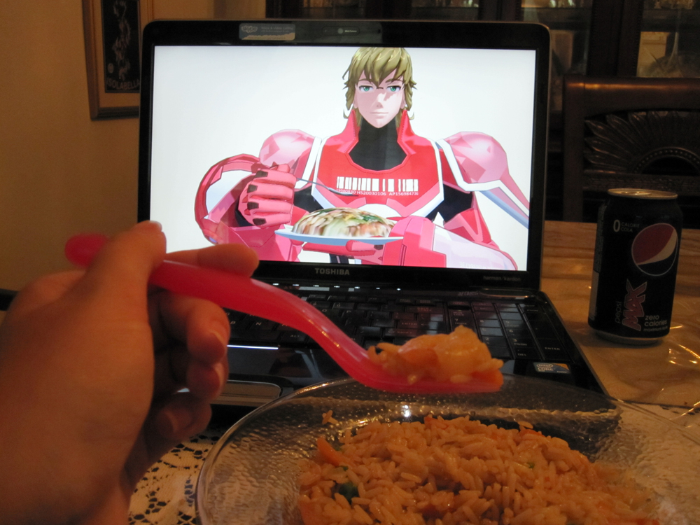 From Schala-Kitty. “I got a little creative and loaded up a Barnaby model in MikuMikuDance and posed him with a plate of fried rice and a fork so we could both share. I’ll have to see if I can get my dad to participate too – he’s proof that there are older guys who like this show. *laughs*”