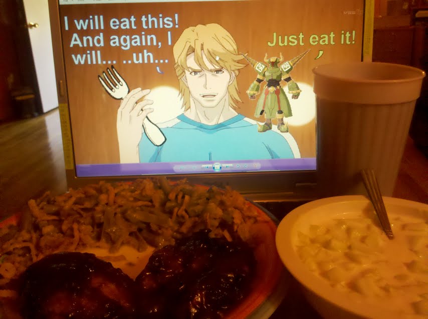 From S.D. “There is green tea in the cup, barbecue and casserole on the plate, and cucumbers in mayonnaise sauce in the bowl. :)”