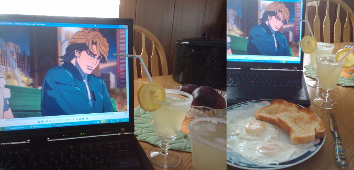 From Eri. “I figured tons of people would be doing fried rice for the main characters, so I made fried rice and fundoshi club-style lemonade (see drama CDs) for Keith ❤ Looks like he's not used to being cooked for, haha. I also tried sucking the yolk out of my eggs, Sky High style- it wasn't terrible!"