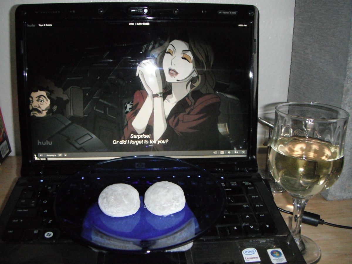 From KC. “I couldn’t figure out what to feed her, but after Ep 25, I decided Maverick’s balls were the most appropriate offering. (They’re actually daifuku mochi, but they look the part.)”